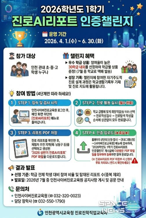 스페이스뉴스 스페이스뉴스 기자 | 인천광역시교육청은 학생 자기주도적 진로 설계 역량을 강화하기 위하여, 4월 1일부터 6월 30일까지 ‘1학기 진로 AI리포트 인증 챌린지’를 운영한다.