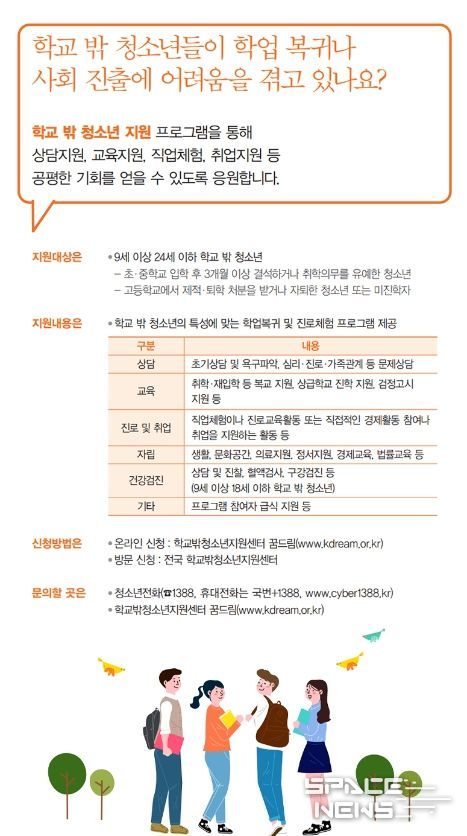 스페이스뉴스 관리자 기자 | 학교 밖 청소년 지원 프로그램을 통해 상담지원, 교육지원, 직업체험, 취업지원 등 공평한 기회를 얻을 수 있도록 응원합니다.