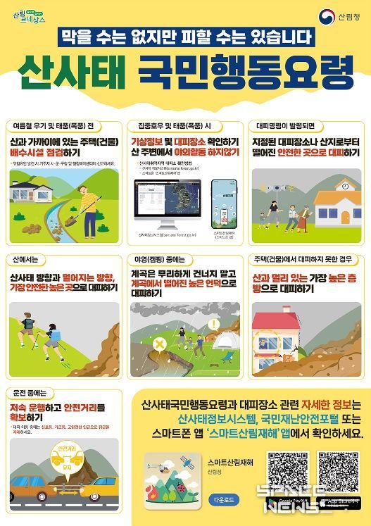 산사태국민행동요령과 대피장소 관련 자세한 정보는 산사태정보시스템, 국민재난안전포털 또는 스마트폰 ‘스마트산림재해’앱에서 확인하세요.