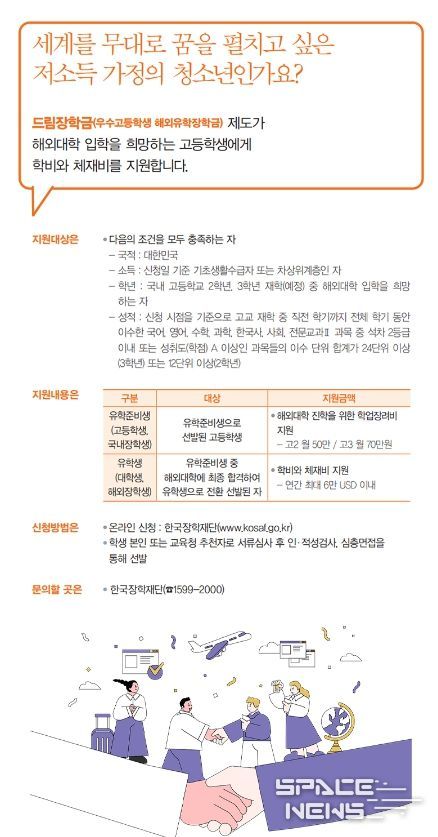 스페이스뉴스 관리자 기자 | 드림장학금(우수고등학생 해외유학장학금) 제도가 해외대학 입학을 희망하는 고등학생에게 학비와 체재비를 지원합니다.