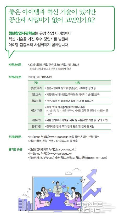 스페이스뉴스 스페이스뉴스 기자 | 청년창업사관학교는 유망 창업 아이템이나 혁신 기술을 가진 우수 창업자를 발굴해 아이템 검증부터 사업화까지 함께합니다.