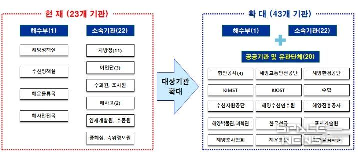 기존에는 지방해양수산청, 어업관리단 등 23개 해양수산부 소속기관에만 공유가 됐으나, 앞으로는 항만공사, 수협중앙회, 해운조합 등 20개 유관기관까지 총 43개 기관이 해양수산 재난‧재해 안전정보를 공유하게 될 예정이다. 또한, 안전정보도 지침, 정책동향 등 16개 항목에서 종사자 교육, 안전보건 의무이행, 재해사례 등 11개 항목을 추가하여 총 27개 항목으로 확대한다.