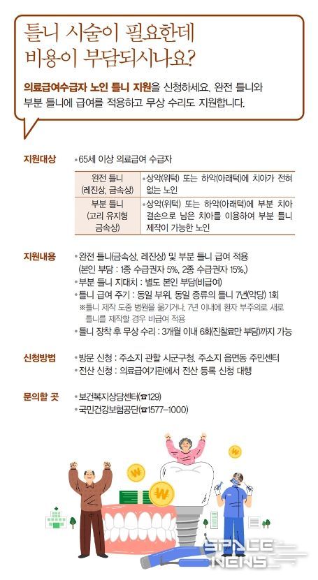 스페이스뉴스 스페이스뉴스 기자 | 의료급여수급자 노인 틀니 지원을 신청하세요. 완전 틀니와 부분 틀니에 급여를 적용하고 무상 수리도 지원합니다.