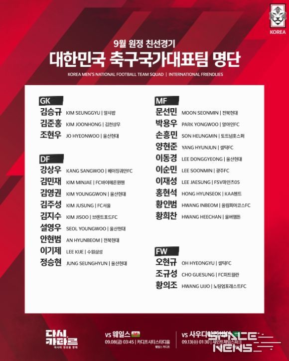 그러나 같은 아시안게임 멤버인 설영우(울산현대)와 홍현석(KAA헨트)은 클린스만 감독의 뜻에 따라 우선 A대표팀에 소집된다.