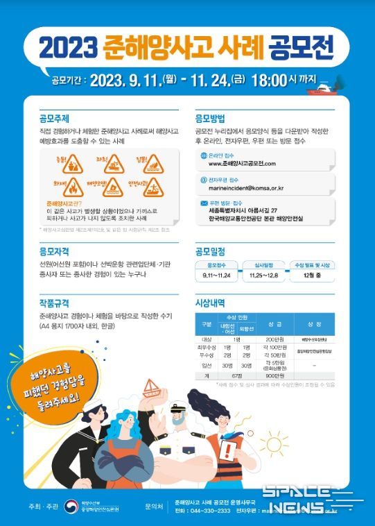 스페이스뉴스 스페이스뉴스 기자 | 해양수산부 중앙해양안전심판원(원장 강용석)은 준해양사고 사례를 발굴하여 유사한 사고를 예방하는 데 활용하기 위해 9월 11일부터 11월 24일까지 ‘2023년도 준해양사고 사례 공모전’을 개최한다.