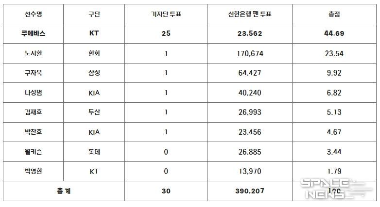 스페이스뉴스 스페이스뉴스 기자 | KT 쿠에바스가 2023 신한은행 SOL KBO 리그 8월 월간 MVP로 선정됐다.