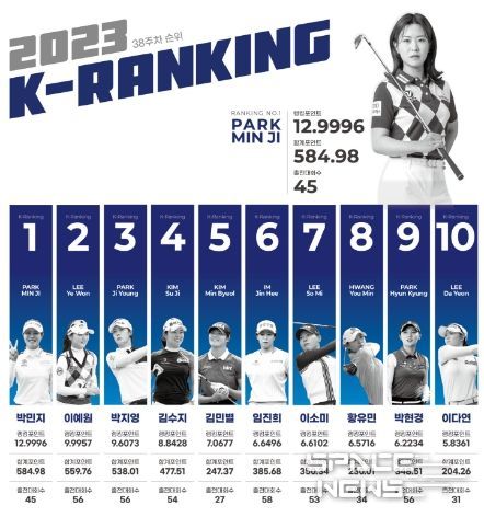 2023년 38주차 기준 K랭킹 1위는 12.9996포인트를 쌓은 박민지(25,NH투자증권)로 123주 연속 K랭킹 1위를 유지하고 있다. 이는 역대 최다이자 최장 기록으로 박민지는 생애 첫 다승이었던 ‘2021 NH투자증권 레이디스 챔피언십’에서 우승하며 K랭킹 1위에 올라선 뒤 지금까지 한 번도 선두 자리를 내주지 않고 있다.