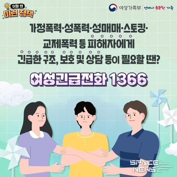 스페이스뉴스 스페이스뉴스 기자 | 가정폭력·성폭력·성매매·스토킹·교제폭력 등 피해자에게 긴급한 구조·보호 및 상담 등이 필요할 땐?
