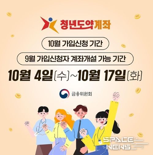스페이스뉴스 스페이스뉴스 기자 | 청년도약계좌 10월 가입신청 기간은 10월 4일(수)~10월 17일(화)으로 가입요건 확인 후 11월 1일(수)~11월 17일(금)까지 계좌개설이 가능합니다.