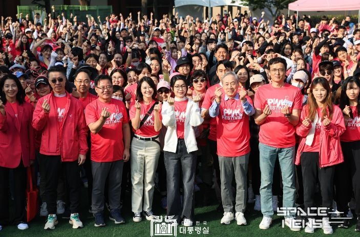 스페이스뉴스 스페이스뉴스 기자 | 김건희 여사는 10월 15일 오전, 10월 유방암 예방의 달을 맞아 서울 용산공원에서 열린 ‘2023 핑크 페스티벌’에 참석했다. 올해로 23회째를 맞이한 핑크 페스티벌은 유방암 조기검진의 중요성을 알리고 유방암에 대한 인식을 향상하기 위한 핑크리본 캠페인의 일환이다. 지난 12일(목) 대한암협회 명예회장으로 추대된 김 여사는 첫 행보로 2023 핑크 페스티벌 현장을 찾았다.