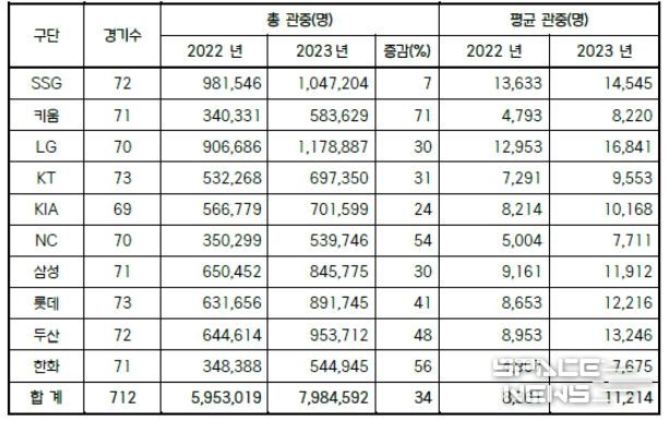 평균 관중은 11,214명으로 지난해 동일 경기 수 대비 34% 늘어났으며 10개 구단 모두 지난해와 비교해 평균 관중이 증가했다. 편성된 모든 경기를 마친 키움은 평균 관중 수가 71% 상승하여 가장 높은 상승률을 기록했으며, 한화 56%, NC 54%로 뒤를 잇고 있다.