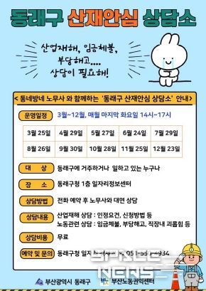 스페이스뉴스 스페이스뉴스 기자 | 부산 동래구는 산업재해 예방과 노동자의 권익 보호를 위해‘동래구 산재안심 상담소’를 3월부터 운영한다고 밝혔다.