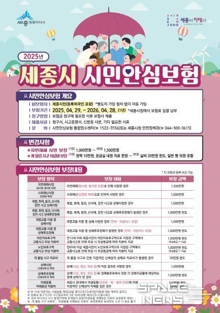 시민안심보험은 세종시에 주민등록을 두고 있는 시민이라면 별도 절차 없이 자동 가입되고, 보험료는 전액 세종시에서 부담한다.