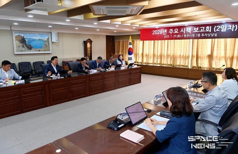 스페이스뉴스 스페이스뉴스 기자 | 원주시는 지난 29일 녪년 주요 시책 보고회’2일차 일정을 진행했다. 이날 보고회에서는 홍보, 민원, 보건, 농업, 교육 등 시민의 삶과 직접 맞닿아 있는 부서의 2026년도 행정 방향과 시민 체감형 시책을 공유하고 실행 전략을 논의했다.
