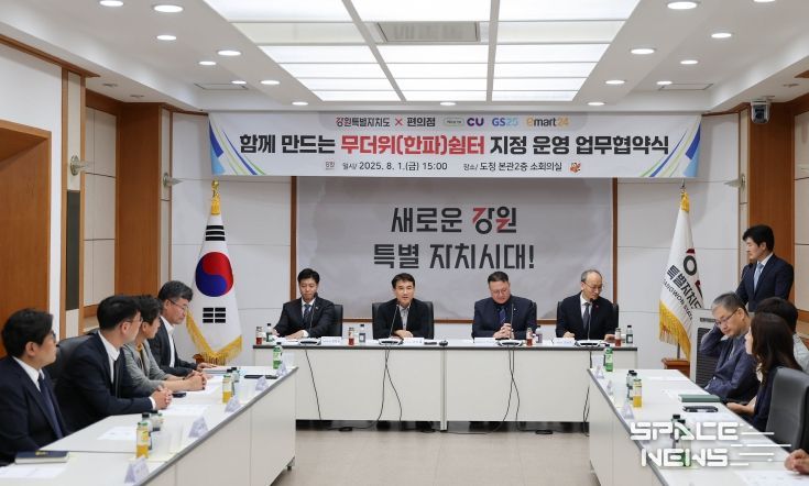 스페이스뉴스 스페이스뉴스 기자 | 강원특별자치도는 8월 1일 오후 3시 30분, 도청 본관 회의실에서 광역자치단체 최초로 ㈜BGF 리테일, ㈜GS리테일, ㈜이마트24 등 편의점 3사와 무더위 쉼터 운영을 위한 업무협약을 체결했다.