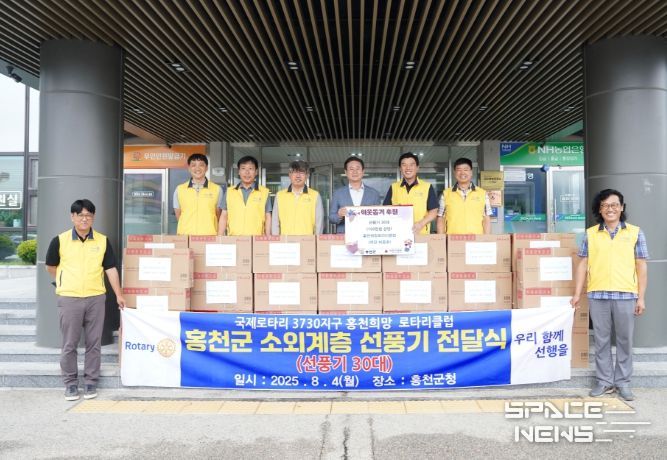 스페이스뉴스 스페이스뉴스 기자 | 홍천희망로타리클럽(회장 최종호)은 8월 4일 홍천군청에 방문하여, 총 150만원 상당의 선풍기 30대를 기탁했다.