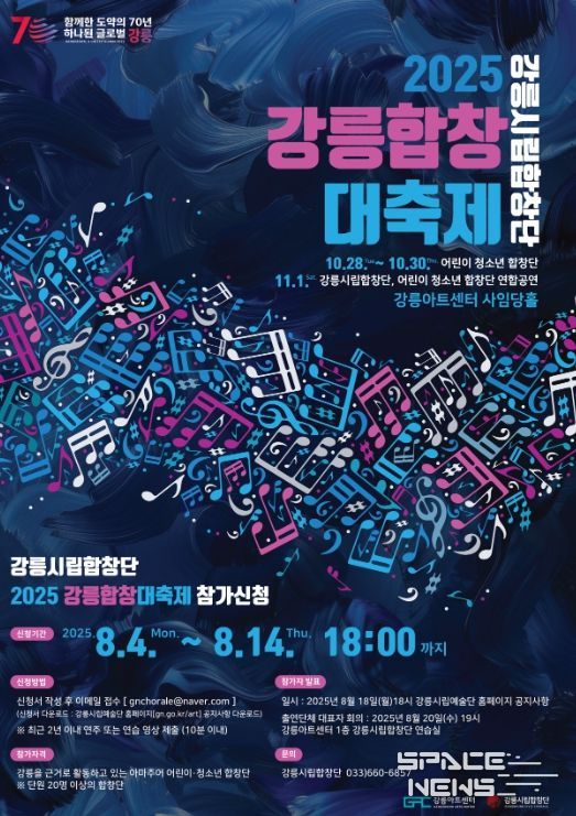 스페이스뉴스 스페이스뉴스 기자 | 음악으로 하나 되는 화합의 장 '2025 강릉합창대축제'가 오는 10월 28일부터 11월 1일까지 강릉아트센터 사임당홀에서 개최된다.