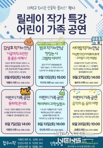 모든 프로그램은 무료로 운영되며, 참여 신청과 자세한 사항은 각 도서관(석봉, 안산, 송촌)또는 대덕구 도서관 홈페이지를 통해 확인할 수 있다.