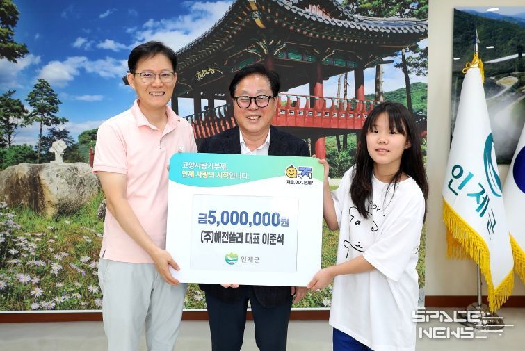 스페이스뉴스 스페이스뉴스 기자 | ㈜해전쏠라 이준석 대표가 12일 인제군에 고향사랑기부금 500만원을 기탁하고 인제군의 발전을 응원했다. ㈜해전쏠라는 김천에 본사를 둔 내진 태양광 특허기업으로, 태양광 설계‧제작 및 시공을 전문으로 하는 기업이다.