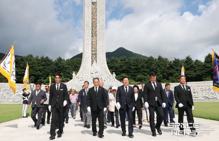 스페이스뉴스 스페이스뉴스 기자 | 이장우 대전시장이 제80주년 광복절을 맞아 15일 오전 유성구 국립대전현충원을 찾아 순국선열과 호국영령을 참배했다. 이날 참배에는 양준영 광복회 대전시지부장, 서승일 대전지방보훈청장, 보훈 단체장, 독립 유공자 유가족 등 80여 명이 함께했다.