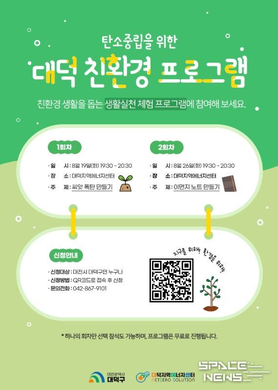 스페이스뉴스 스페이스뉴스 기자 | 대전 대덕구가 주민들의 탄소중립 실천과 친환경 생활 문화 확산을 위해 오는 10월까지 월별 ‘친환경 체험 프로그램’을 운영한다고 14일 밝혔다.