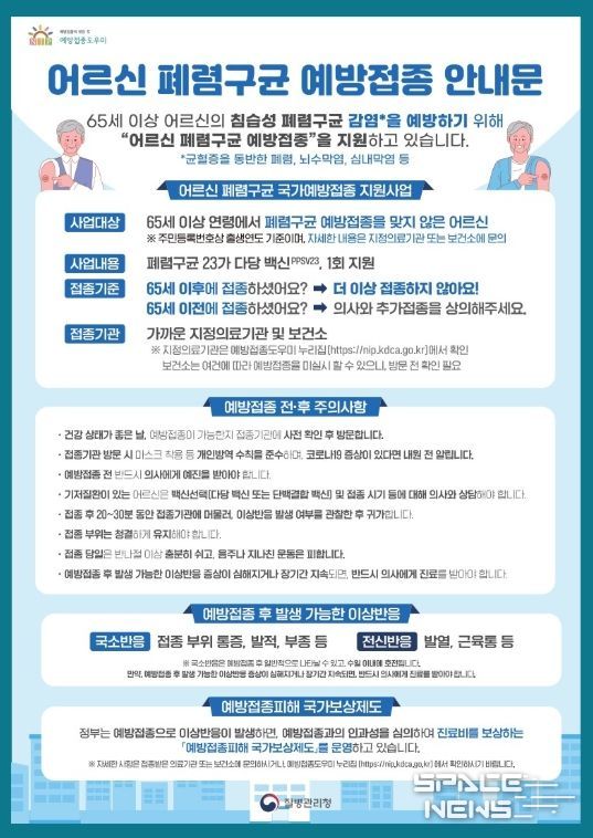 스페이스뉴스 스페이스뉴스 기자 | 대전 서구는 65세 이상 어르신(올해 기준 1960년 12월 31일 이전 출생자)을 대상으로 폐렴구균 무료 예방접종을 시행하고 있다고 이달 19일 밝혔다.