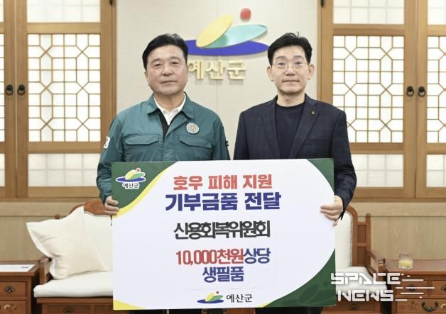 스페이스뉴스 스페이스뉴스 기자 | 예산군은 신용회복위원회 대전충청지역본부로부터 집중호우로 피해를 입은 이재민을 위한 1000만원 상당의 생필품을 기탁받았다고 19일 밝혔다.