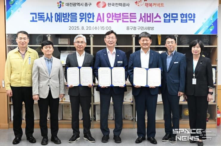 스페이스뉴스 스페이스뉴스 기자 | 대전 중구는 고독사 예방 및 위기 상황 신속 대응을 위해 한국전력공사 대전세종충남본부, (재)행복커넥트와 업무협약을 체결하고 지역 내 고립가구 50명을 대상으로 “AI안부든든 서비스”를 시범 운영한다고 20일 밝혔다.
