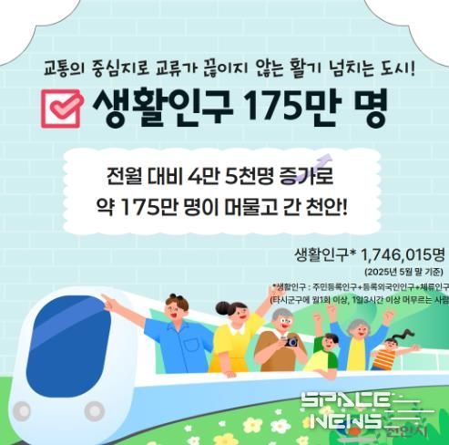 스페이스뉴스 스페이스뉴스 기자 | 천안시는 지난 5월 사상 처음으로 인구 70만 명을 돌파한 이후 꾸준히 증가하고 있다고 21일 밝혔다.