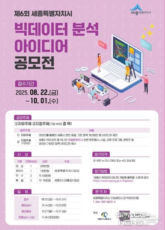 스페이스뉴스 스페이스뉴스 기자 | 세종특별자치시가 시민의 창의적인 아이디어로 도시 문제를 해결하고 빅데이터 활용을 활성화하기 위해 ‘제6회 빅데이터 분석 아이디어 공모전’을 개최한다.