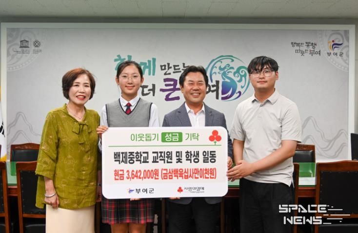 이에 박정현 부여군수는 “백제중학교 학생들과 교직원들의 이웃사랑과 따뜻한 마음에 깊이 감사드리며, 이러한 마음이 지역사회에 큰 힘이 되어 어려운 이웃들에게 큰 희망이 될 것이다.”라며 감사의 마음을 전했다.