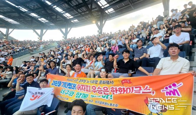스페이스뉴스 스페이스뉴스 기자 | 대전 서구와 서구공무원노동조합은 지난 21일 한화이글스 홈경기에 직원 300여 명이 방문, 야구 경기를 관람하며 노사 화합의 날을 보냈다고 전했다.