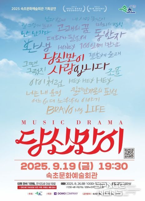 스페이스뉴스 스페이스뉴스 기자 | 속초문화예술회관이 오는 9월 19일 저녁 7시 30분, 기획공연 뮤직드라마 ‘당신만이’를 선보인다.