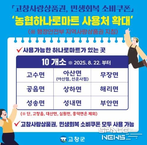 스페이스뉴스 스페이스뉴스 기자 | 고창군이 면 지역 주민들의 실생활 편의를 높이고 지역 내 소비 활성화를 위해 관내 면 지역 10개 농협 하나로마트에서 ‘고창사랑상품권’과 ‘민생회복소비쿠폰’ 사용이 가능하다고 25일 밝혔다.