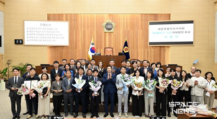 스페이스뉴스 스페이스뉴스 기자 | 세종특별자치시의회는 제100회 임시회 종료 후 본회의장에서 ‘제100회기 기념 의정발전 유공자 시상식’을 개최하고, 지방의회 본연의 핵심 기능 수행으로 의정발전에 기여한 26명(개인 25명·단체 1팀)에게 표창을 수여했다.