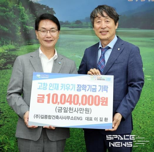 스페이스뉴스 스페이스뉴스 기자 | ㈜길종합건축사사무소ENG가 지난 25일 오후 고창군장학재단에 1004만원의 장학금을 기탁하며 고창군 학생들의 학업과 성장을 응원했다.