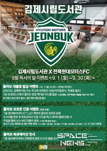 스페이스뉴스 스페이스뉴스 기자 | 김제시립도서관은 오는 9월 1일 월요일부터 한 달 동안 전북현대모터스FC와 9월 독서의 달 콜라보 행사를 진행한다고 밝혔다.