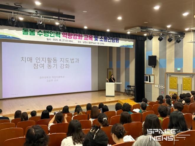 스페이스뉴스 스페이스뉴스 기자 | 남원시는 치매환자 돌봄 수행 인력의 전문성 강화와 돌봄 서비스 질 향상을 위해 2025년 8월 27일 오전 9시, 남원시 평생학습관 3층 강연장에서 전문 교수 초빙하여 역량 강화 교육을 실시했다.