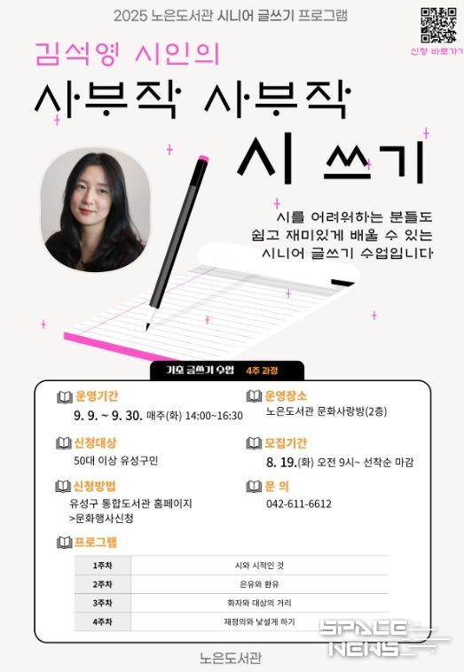 스페이스뉴스 스페이스뉴스 기자 | 대전 유성구는 9월 독서의 달을 맞아 노은도서관에서 시니어를 위한 글쓰기 프로그램 ‘김석영 시인의 사부작 사부작 시 쓰기’를 운영한다.