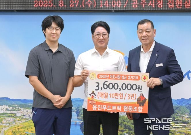 스페이스뉴스 스페이스뉴스 기자 | 공주시는 지난 27일 시청 집현실에서 웅진푸드트럭 협동조합(조합장 양명호)이 매달 10만 원씩 3년 동안 정기 후원을 이어가 총 360만 원을 충남사회복지공동모금회에 기탁하기로 했다고 밝혔다.