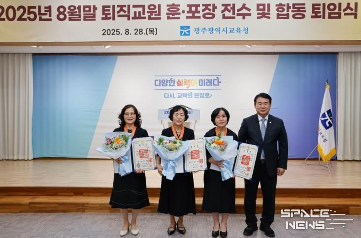 스페이스뉴스 스페이스뉴스 기자 | 광주시교육청은 28일 본청 대회의실에서 올해 2월 말 명예퇴직한 교원과 8월 말 정년퇴직 예정 교원이 참석한 가운데 ‘퇴직교원 훈·포장 전수 및 합동 퇴임식’을 개최했다.