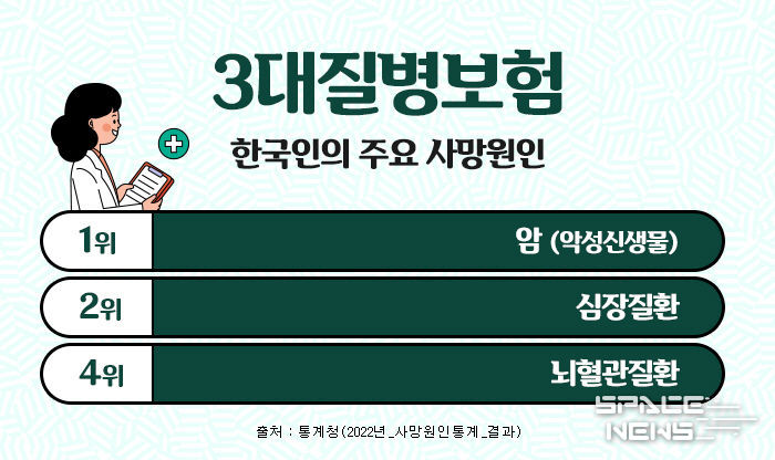 스페이스뉴스 스페이스뉴스 기자 | 한국인의 주요 사망원인중에 암, 뇌혈관질환, 심혈관질환은 흔히 3대질병이라 일컬어지며 살아가면서 가장 먼저 대비해야 하는 중대질병으로 항상 강조되고 있다. 이들 질병에 미리 대비하기 위해 가입하는 것이 진단비보험인데, 이러한 3대질병진단비를 중점으로 보장하는 보장성보험이 3대진단비보험 이다. 3대질병진단비보험은 각각의 질병에 주목해서 보장하기도 하지만, 나에게 맞는 추가 특약을 잘 골라서 가입한다면 종합건강보험으로도 충분히 활용도가 높다.
