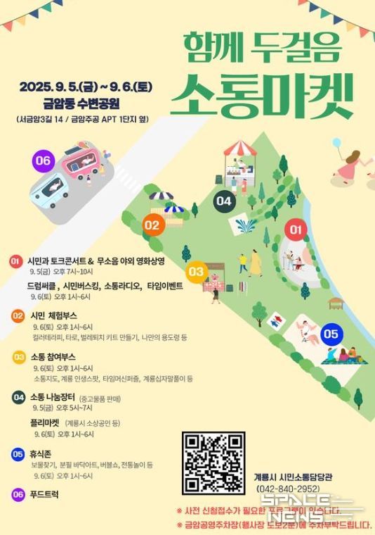 스페이스뉴스 스페이스뉴스 기자 | 계룡시는 오는 5일부터 6일까지 금암동 수변공원에서 시민과 함께 만드는'함께 두 걸음, 소통마켓'행사를 개최한다고 밝혔다.