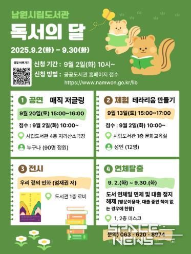 스페이스뉴스 스페이스뉴스 기자 | 남원시공공도서관(어울림·시립·어린이청소년)은 9월 ‘독서의 달’을 맞아 시민들이 책 읽는 즐거움과 다양한 문화생활을 누릴 수 있도록 공연, 전시, 체험 프로그램을 운영한다.