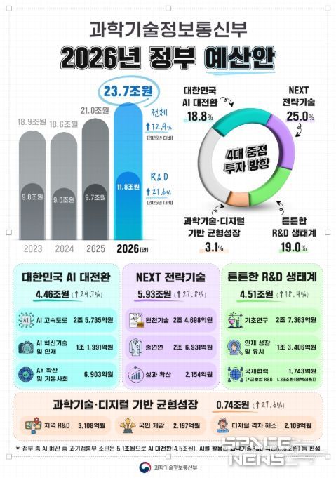 스페이스뉴스 스페이스뉴스 기자 | 과학기술정보통신부는 2026년도 정부 예산안 및 기금운영계획안에 반영된 과기정통부 예산안은 총 23조 7천억원으로 편성됐다고 밝혔다. 이는 2025년 추경예산(21.0조 원) 대비 12.9% 증가한 역대 최대 규모이다. 연구개발(R&D) 예산은 11조 8천억 원으로 전년 대비 21.6% 늘어났으며, 이는 정부 총 연구개발의 약 33.4%을 차지하는 규모이다.