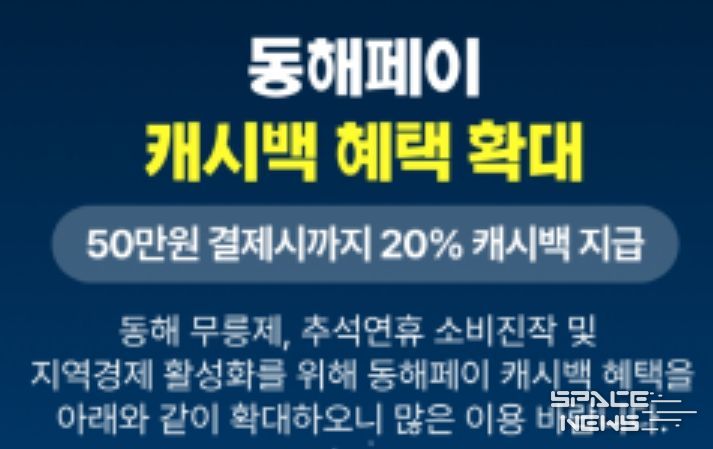 스페이스뉴스 스페이스뉴스 기자 | 동해시는 고물가와 경기 침체로 인한 시민들의 경제적 부담을 덜고 지역경제에 활력을 불어넣기 위해, 오는 9월 1일부터 10월 31일까지 두 달간 동해페이 인센티브 지급률을 기존 10%에서 최대 20%로 특별 상향한다고 27일 밝혔다.