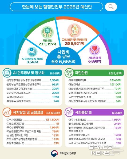 스페이스뉴스 스페이스뉴스 기자 | 행정안전부는 2026년도 예산안을 76조 4,426억 원 규모로 편성했다고 밝혔다. 예산안은 9월 2일 국회 제출 후 상임위, 예결위 심사를 거쳐 본회의 의결을 통해 12월에 확정될 예정이다.