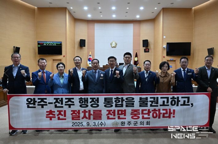 스페이스뉴스 스페이스뉴스 기자 | 완주군의회는 3일 제295회 임시회 제1차 본회의에서 서남용 의원이 대표 발의한 ‘완주-전주 행정통합 불권고 및 추진절차 전면 중단 촉구 결의안’을 만장일치로 채택했다.