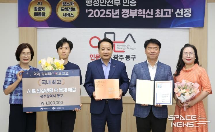 스페이스뉴스 스페이스뉴스 기자 | 광주 동구는 지난 2일 행정안전부 주관 2025 정부혁신 최초·최고 공모에서 ‘전국 최고’ 기관으로 선정, 인증패를 받았다고 밝혔다.