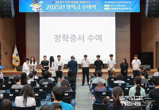 스페이스뉴스 스페이스뉴스 기자 | (재)전북특별자치도교육청사랑의장학회는 4일 전북특별자치도교육청 2층 강당에서 2025년 장학금 수여식을 개최했다.